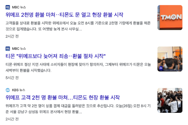 7월 25일 새벽부터 위메프는 일부 소비자들에게 오프라인에서 환불을 해주기 시작하였는데 티몬은 조금 늦은 대응으로 이제야 직원들이 나와 환불을 해주겠다고 나선 상황입니다.
