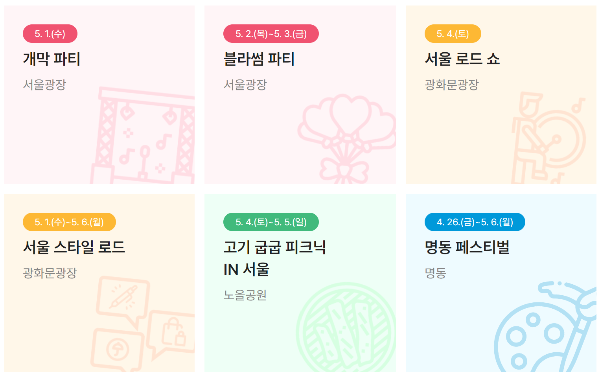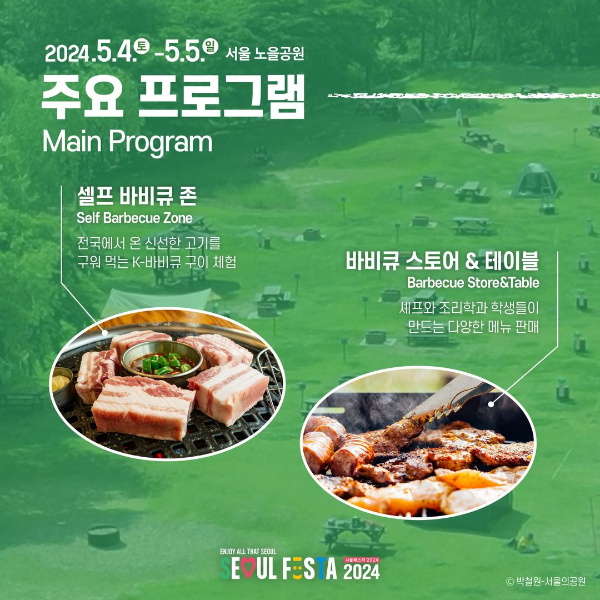 도심과 자연에서 즐기며 서울의 모든 매력을 담은 특별한 봄축제인 서울페스타 2024가 서울광장 개막파티, 광화문광장 로드쇼, 노을공원 콘서트와 함께 열립니다. 5월 1일부터 6일까지 서울광장, 광화문 광장, 노을공원, 명동까지걸쳐 개막파티, 로드쇼, 콘서트, 그리고 바비큐 존까지 다양한 이벤트들이 열립니다.