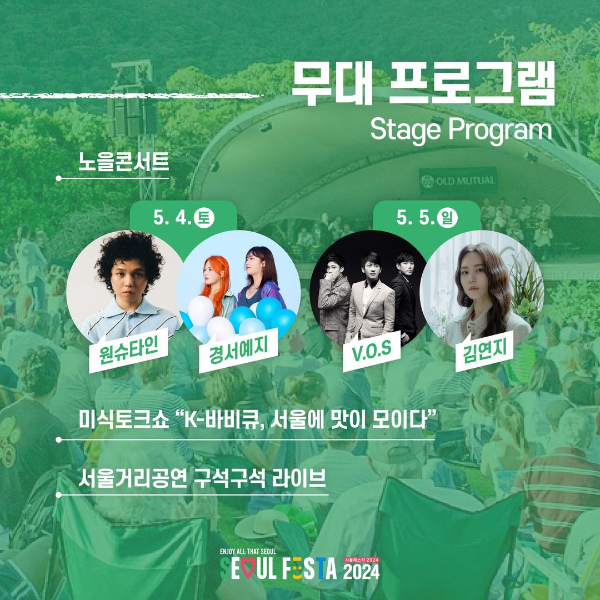 서울페스타 2024년 서울광장, 광화문광장 뿐만 아니라 노을공원 및 명동까지 함께 어우러져 서울을 대표하는 행사입니다. 무대 공연으로는 서울광장, 광화문광장처럼 대형무대 뿐 아니라, 피크닉 분위기의 돗자리석에서 힐링하며 즐길 수 공연을 노을공원에서 즐기실 수 있습니다. 노을공원에서는 바비큐 존도 같이 예약제로 운영되고 있고 노을공원 콘서트는 2일간 공연을 진행하며, 1일차인 5월 4일 토요일에는 원슈타인과 경서예지, 5월 5일 일요일에는 V.O.S와 김연지까지 실력파 뮤지션들이 출연합니다. 바비큐존을 즐기며 해지는 노을과 함께 분위기 있는 공연을 함께 관람하며 가족, 친구, 연인과 함꼐 힐링하기에 좋을 것 같습니다.