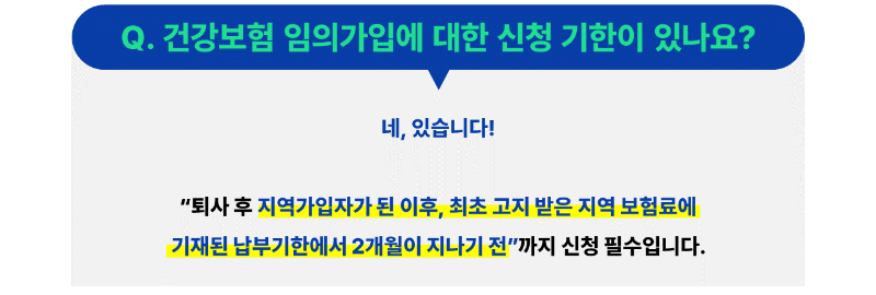건강보험 임의계속가입에 대한 신청기한이나 유지기한이 있는지도 많이 궁금해 하시는데요. 건강보험 임의계속가입은 신청 기한이 있습니다! 퇴사 후 지역가입자가 된 이후 최초 고지 받은 지역 보험료에 기재된 납부기한에서 2개월이 지나기 전까지입니다.