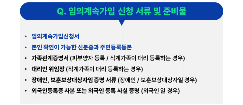 말 그대로 임의적으로 계속(직장)가입자로 남겠다는 의미와 동일하다고 보시면 됩니다. 만일 가입자분이 계속 보험료를 납부할 의지가 있으나 보험료가 부담이 되는 경우, 퇴사 후 지역가입자로 전환 되기 전에 공단에 가셔서 신청 하시면 직장가입자만큼의 보험로만 납부 하실 수 있습니다.